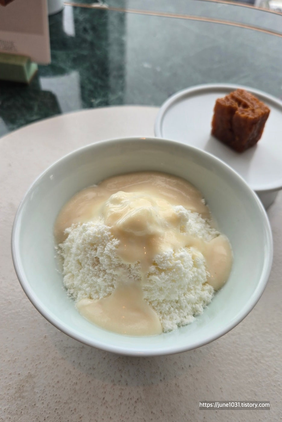 마무리 디저트인 생강 빙수와 술지게미 아이스크림은 따로 먹으면 생강이나 청주 향이 부담스러울 수 있다는 생각이 들었는데, 섞어 먹으니 묘하게 어울리며 깔끔하게 마무리해줬다.