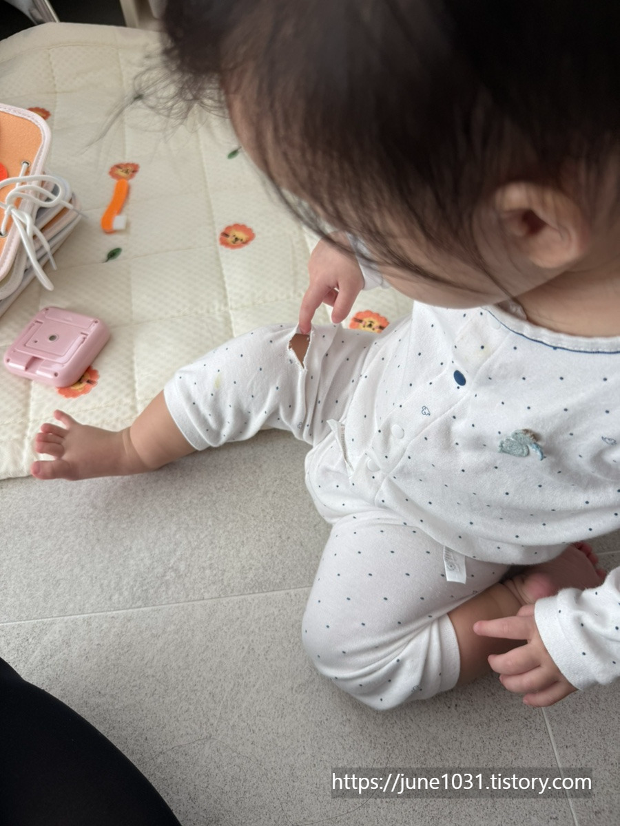 아픈 와중에도 열심히 기어다녀서 옷에 구멍까지 낸 연근이❤️